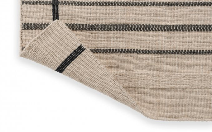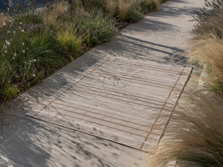 Zona Line utendørsteppe har et moderne stripete mønster i nyanser av kullgrått og beige, noe som gir et elegant uttrykk til dine uteområder.