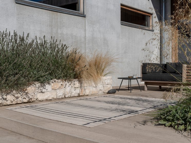 Oppgrader dine uteområder med det stilrene Zona Line utendørsteppet fra Brink & Campman. Dette teppet kombinerer moderne design med høy kvalitet, og tilfører en sofistikert atmosfære til enhver terrasse, balkong eller hage.